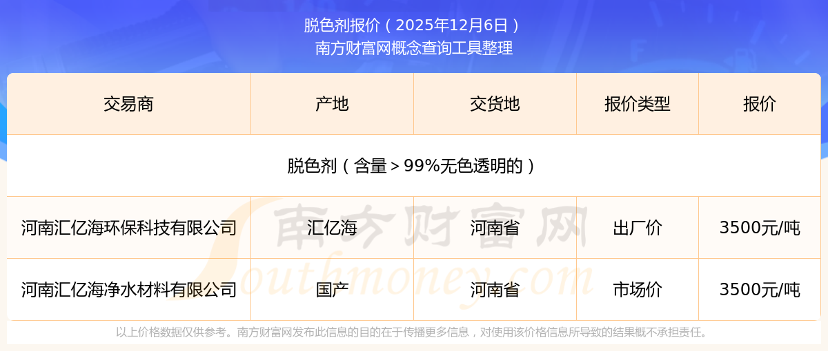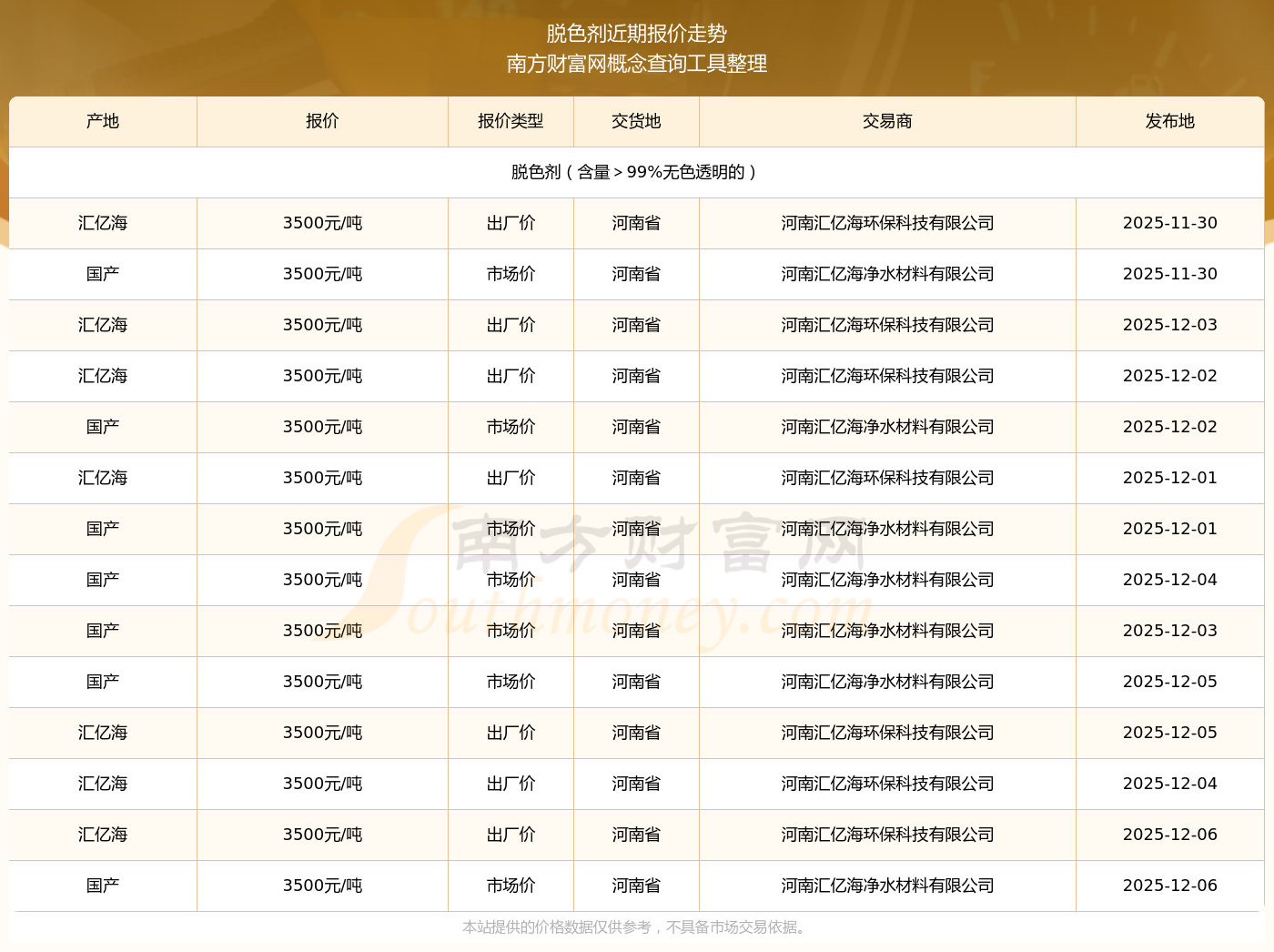 2025年12月6日,河南匯億海環保科技有限公司脫色劑(含量>99%無色透明的),匯億海,交易地點為河南省,報價為3500.00元/噸。
