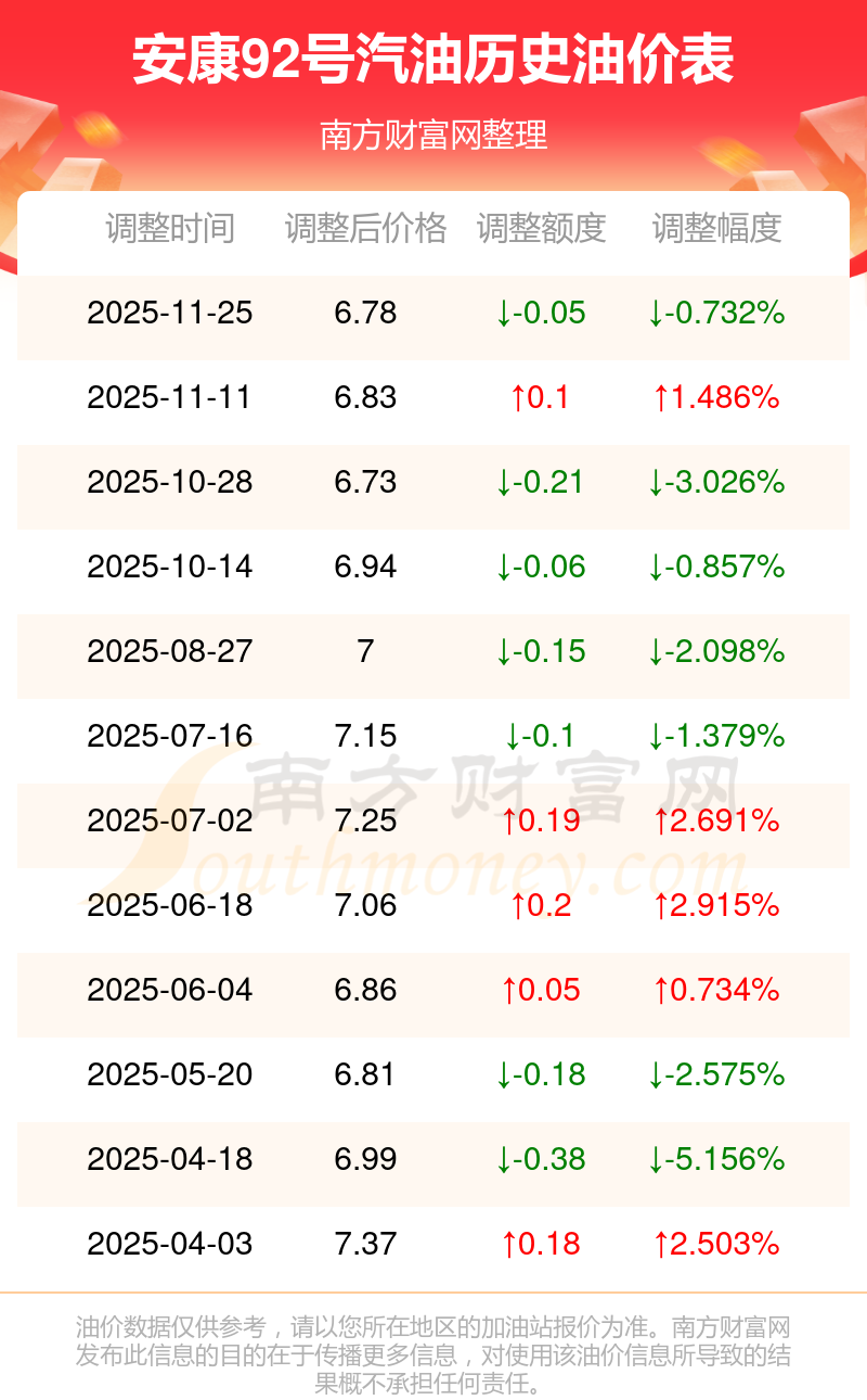 2025年92號汽油價(jià)格調(diào)整一覽表