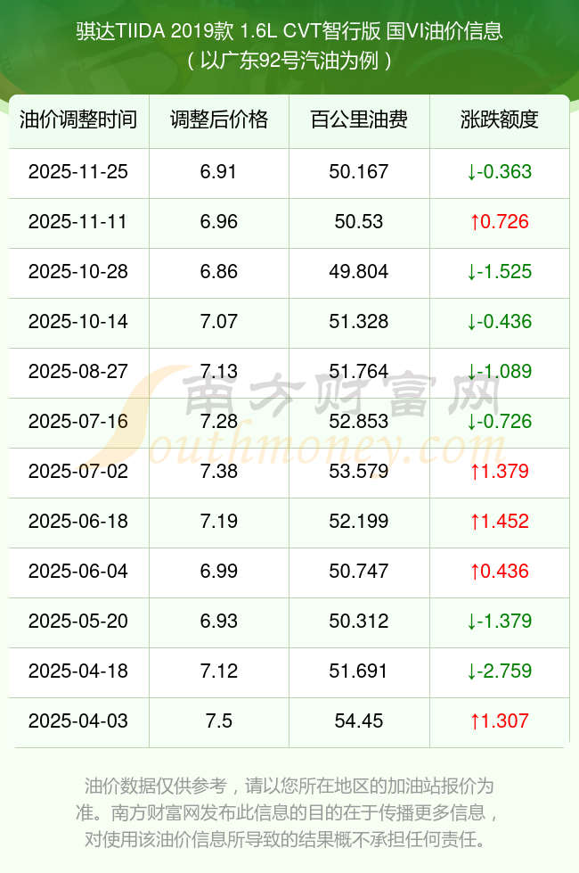 按11月25日92號汽油最新調整價格6.91元每升來計算(以廣東為例),該車型百公里平均油費為50.167元,按上一輪11月11日調整價格6.96元每升來計算,百公里平均油費為50.53元,對比上一輪少花0.363元,下一輪油價調整時間為12月8日24時。