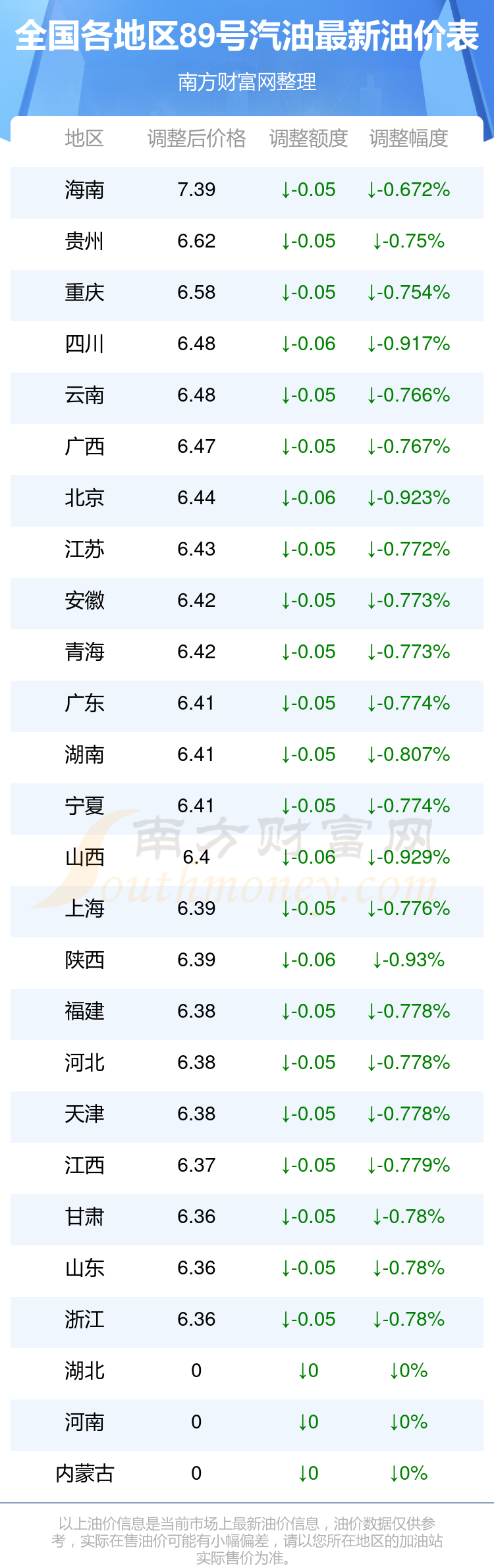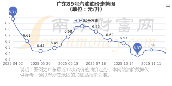 12月7日,廣東89號汽油的價格是6.41元每升,本次的調整時間為11月25日,對比上次的調整下降了0.05元,下降0.774%,下次調整時間為12月8日24時,還有1.59天。