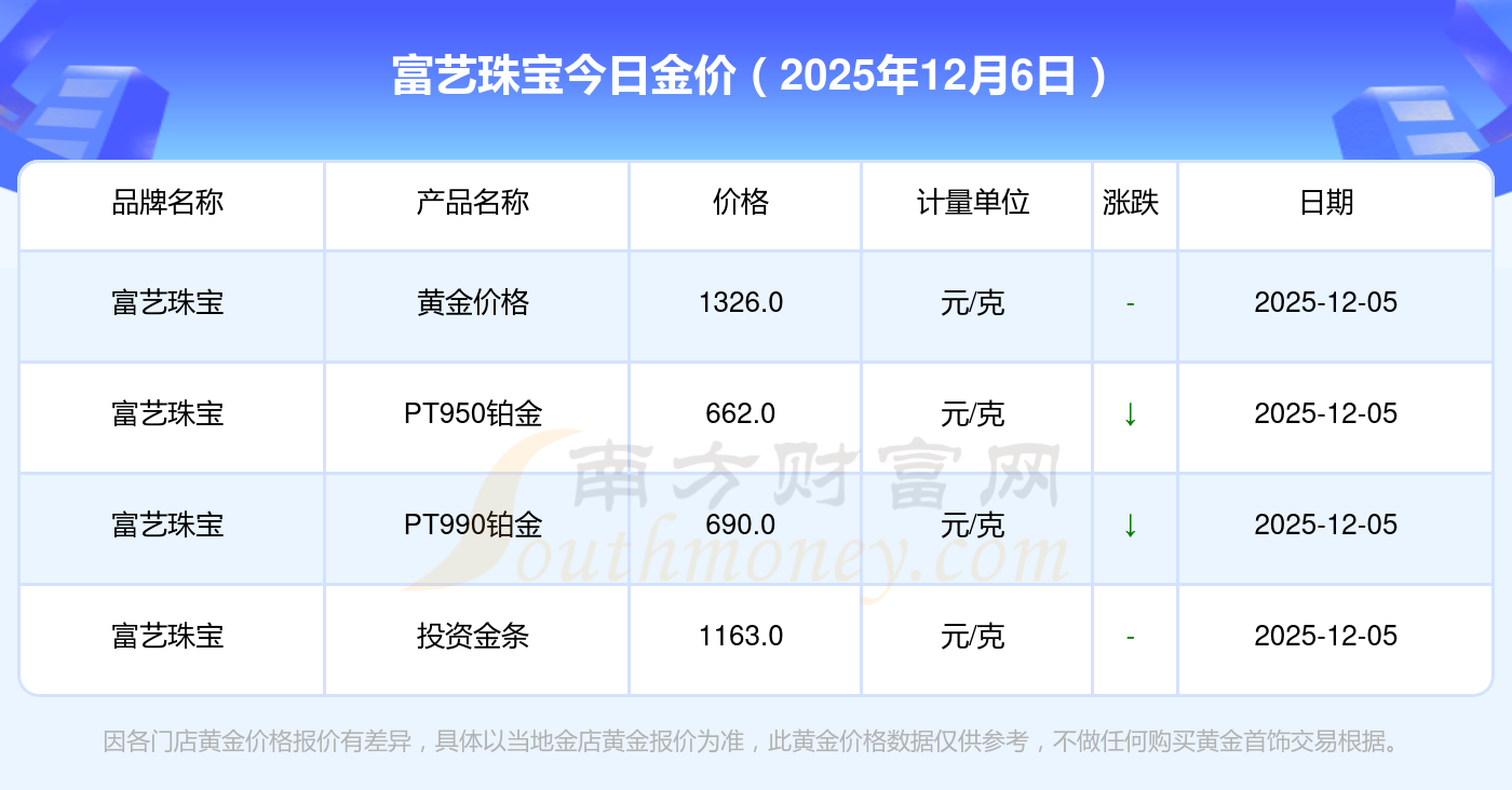 2025年12月6日,周大福、周大福、周大福、周大福、周大福、周大福、周大福、老鳳祥、老鳳祥、老鳳祥、周六福等各大金店品牌投資金條今日價格如下:周大福1328.0元/克、周大福662.0元/克、周大福1328.0元/克、周大福46550.0、周大福18970.0、周大福41990.0、周大福1165.0元/克、老鳳祥1325.0元/克、老鳳祥600.0元/克、老鳳祥1325.0元/克、周六福1289.0元/克。