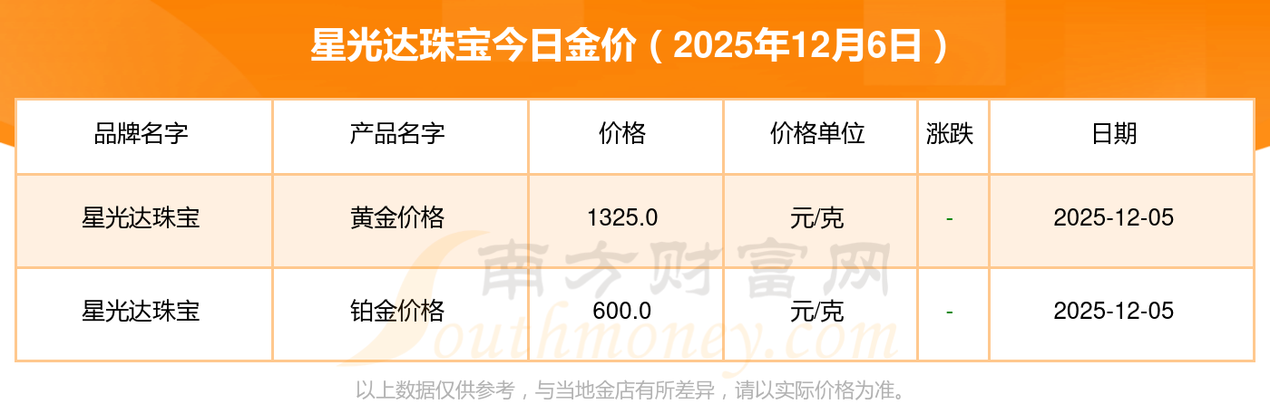 2025年12月6日星光達珠寶最新價格:黃金價格1328.0元/克,鉑金價格662.0元/克,飾品金價(內地)1328.0元/克,黃金飾品(香港)46550.0,鉑金價格(香港)18970.0,金條價格(香港)41990.0,金條金價(內地)1165.0元/克,黃金價格1325.0元/克,鉑金價格600.0元/克,足金價格1325.0元/克,黃金價格1289.0元/克。