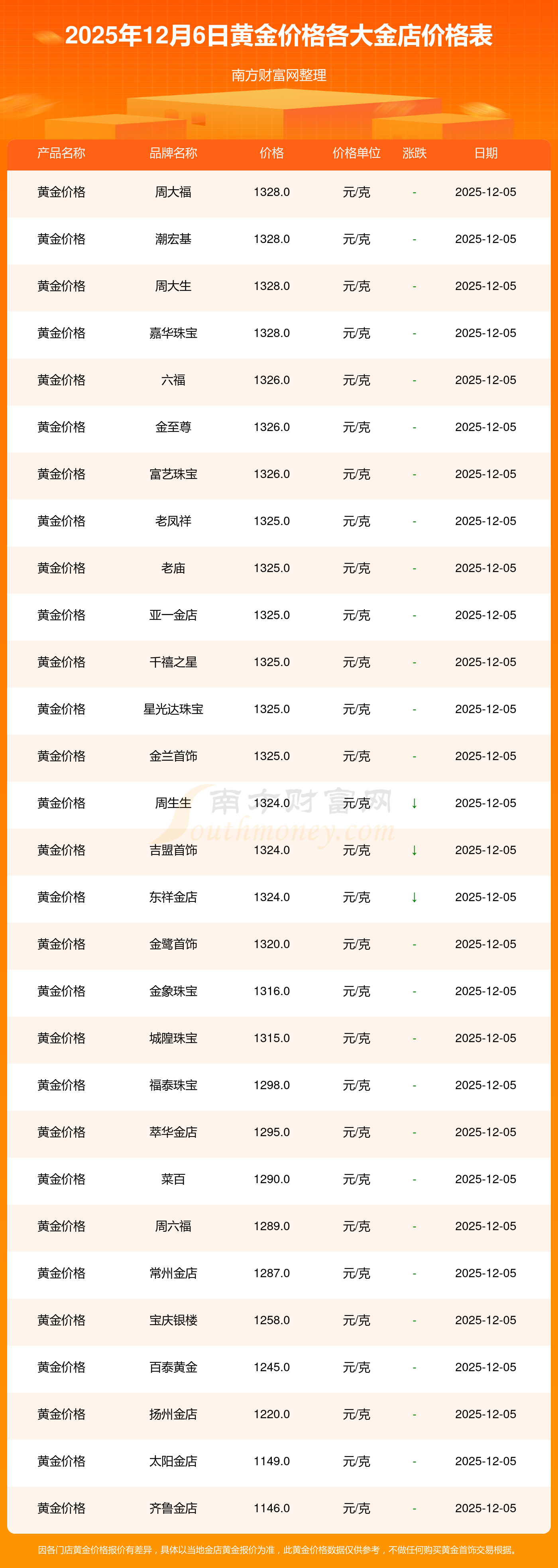 2025年12月6日,周大福、周大福、周大福、周大福、周大福、周大福、周大福、老鳳祥、老鳳祥、老鳳祥、周六福等各大金店品牌黃金價格今日價格如下:周大福1328.0元/克、周大福662.0元/克、周大福1328.0元/克、周大福46550.0、周大福18970.0、周大福41990.0、周大福1165.0元/克、老鳳祥1325.0元/克、老鳳祥600.0元/克、老鳳祥1325.0元/克、周六福1289.0元/克。