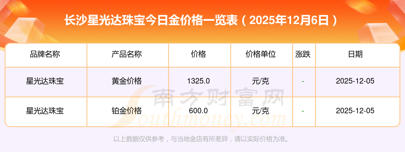 今日黃金價格查詢_現在金價黃金一克多少錢,黃金價格是多少錢一克?2025年12月6日長沙星光達珠寶今日價格:黃金價格1328.0元/克,鉑金價格662.0元/克,飾品金價(內地)1328.0元/克,黃金飾品(香港)46550.0,鉑金價格(香港)18970.0,金條價格(香港)41990.0,金條金價(內地)1165.0元/克,黃金價格1325.0元/克,鉑金價格600.0元/克,足金價格1325.0元/克,黃金價格1289.0元/克。
