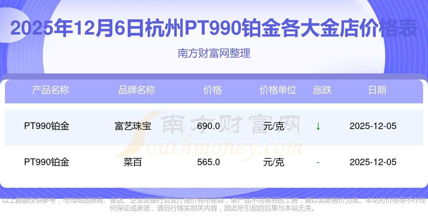 2025年12月6日,杭州周大福、周大福、周大福、周大福、周大福、周大福、周大福、老鳳祥、老鳳祥、老鳳祥、周六福等各大金店品牌PT990鉑金今日價格如下:周大福1328.0元/克、周大福662.0元/克、周大福1328.0元/克、周大福46550.0、周大福18970.0、周大福41990.0、周大福1165.0元/克、老鳳祥1325.0元/克、老鳳祥600.0元/克、老鳳祥1325.0元/克、周六福1289.0元/克。