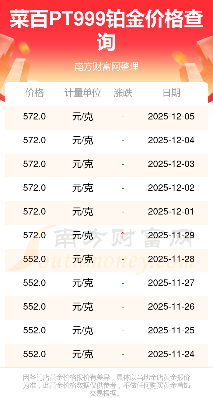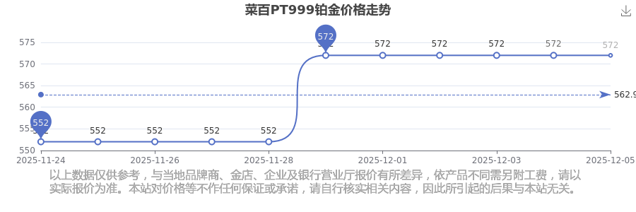 最新數據表明,菜百今日 PT999鉑金價格為572.0元/克。
