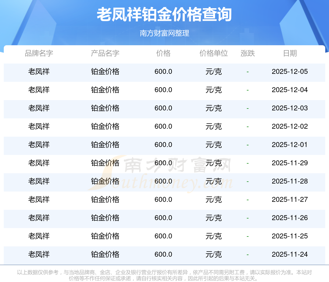 2025年12月6日老鳳祥鉑金價(jià)格最新為600.0元/克。