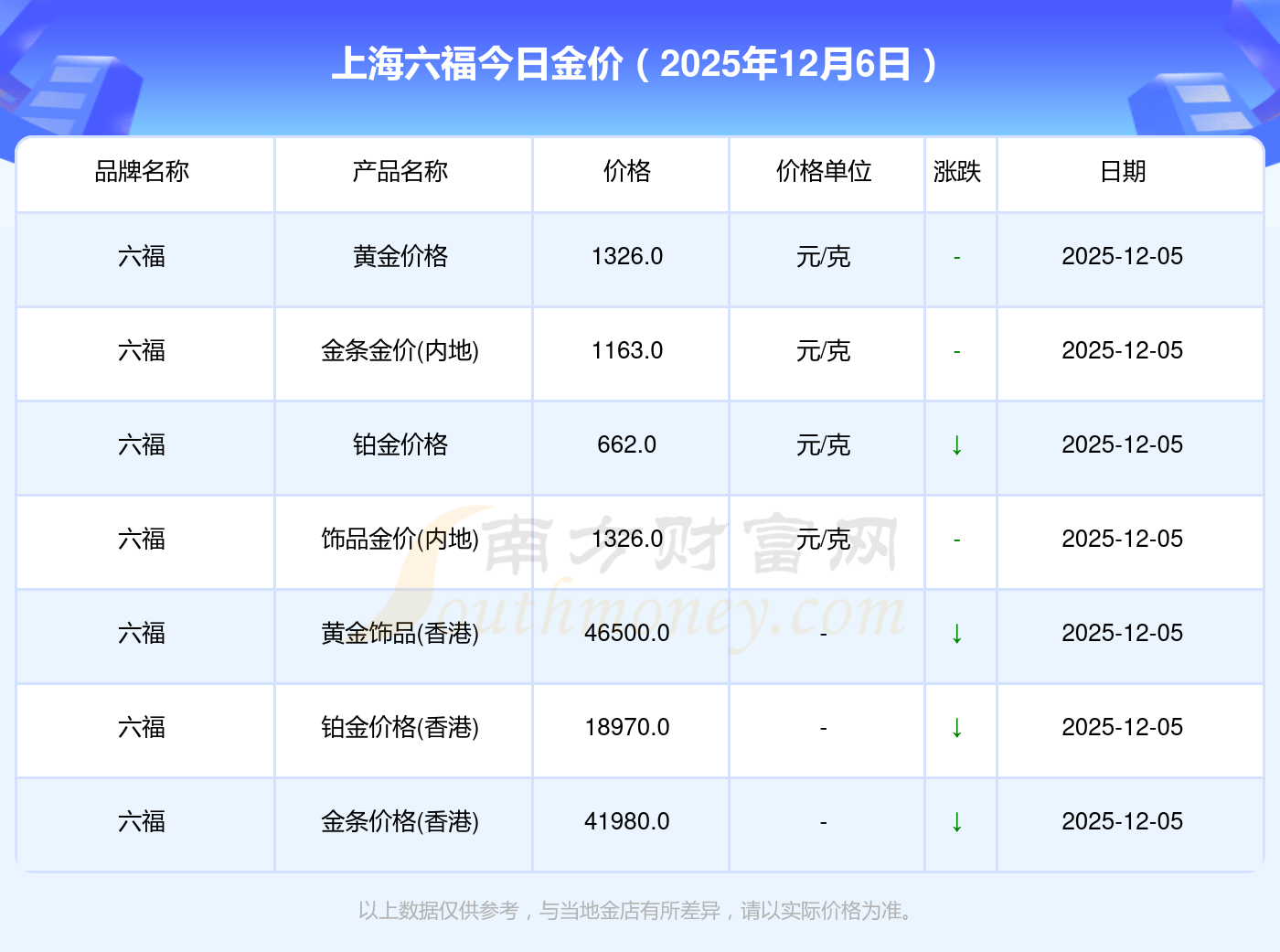 2025年12月6日上海六福黃金按克計價,現(xiàn)在多少錢一克?黃金價格1328.0元/克,鉑金價格662.0元/克,飾品金價(內(nèi)地)1328.0元/克,黃金飾品(香港)46550.0,鉑金價格(香港)18970.0,金條價格(香港)41990.0,金條金價(內(nèi)地)1165.0元/克,黃金價格1325.0元/克,鉑金價格600.0元/克,足金價格1325.0元/克,黃金價格1289.0元/克。