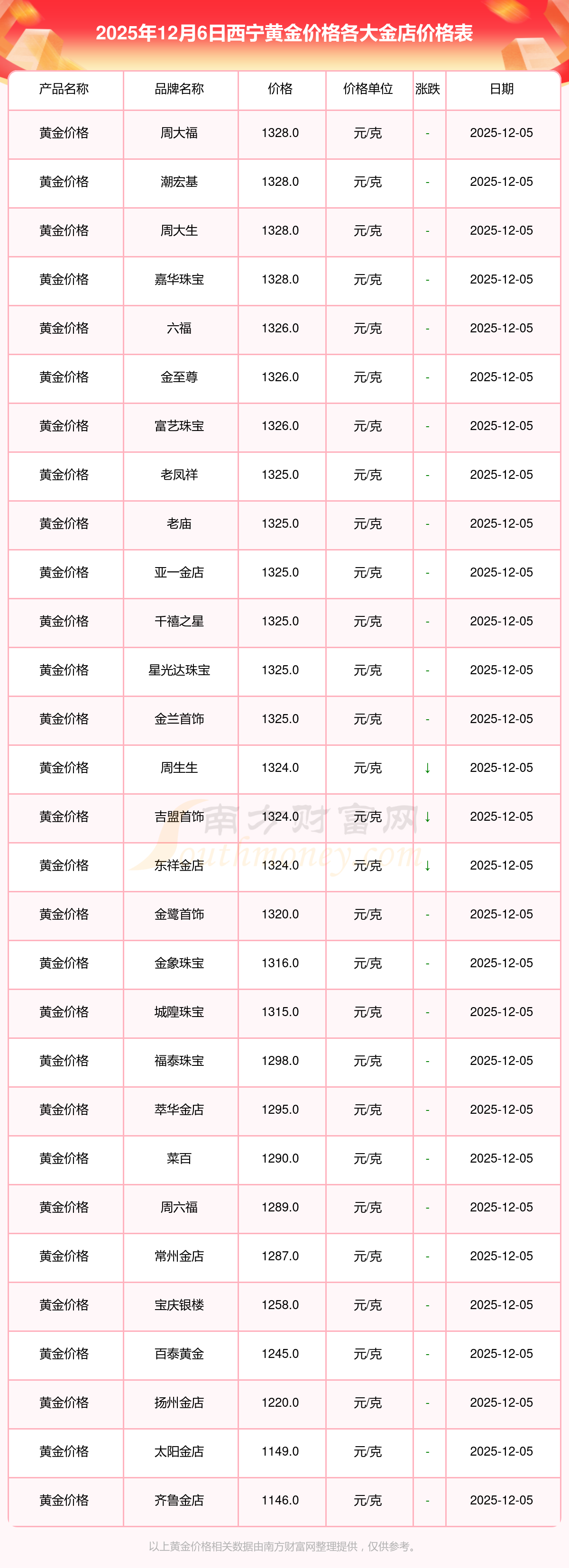 2025年12月6日西寧周大福、周大福、周大福、周大福、周大福、周大福、周大福、老鳳祥、老鳳祥、老鳳祥、周六福等各大金店品牌黃金價格最新價格如下:周大福黃金價格1328.0元/克,周大福鉑金價格662.0元/克,周大福飾品金價(內(nèi)地)1328.0元/克,周大福黃金飾品(香港)46550.0,周大福鉑金價格(香港)18970.0,周大福金條價格(香港)41990.0,周大福金條金價(內(nèi)地)1165.0元/克,老鳳祥黃金價格1325.0元/克,老鳳祥鉑金價格600.0元/克,老鳳祥足金價格1325.0元/克,周六福黃金價格1289.0元/克。