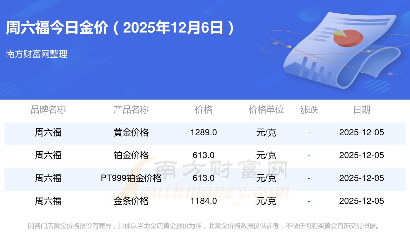 2025年12月6日周六福今日價格:黃金價格1328.0元/克,鉑金價格662.0元/克,飾品金價(內地)1328.0元/克,黃金飾品(香港)46550.0,鉑金價格(香港)18970.0,金條價格(香港)41990.0,金條金價(內地)1165.0元/克,黃金價格1325.0元/克,鉑金價格600.0元/克,足金價格1325.0元/克,黃金價格1289.0元/克。