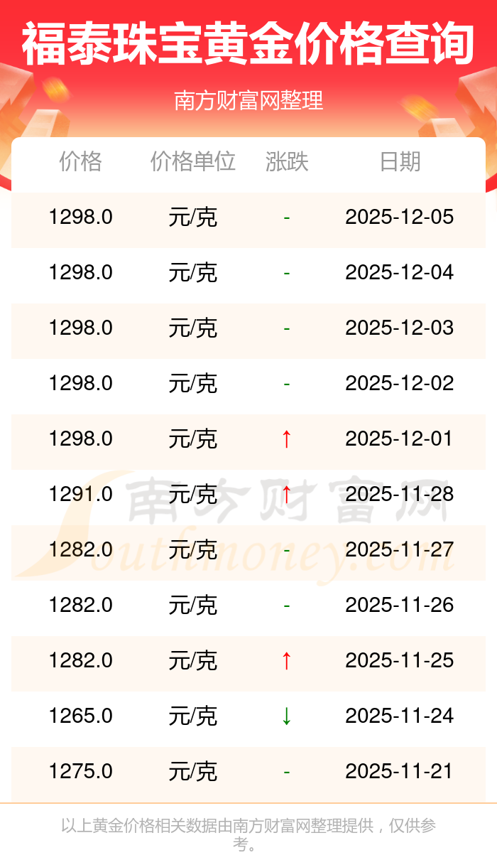 想知道今日黃金價(jià)格,目前黃金一克的價(jià)錢是多少呀?黃金是優(yōu)良的導(dǎo)電導(dǎo)熱材料,具備良好的導(dǎo)熱特性。因其化學(xué)穩(wěn)定性高、抗氧化性強(qiáng),可用來制作高精度電子元件,所以在電子工業(yè)的特殊電路設(shè)計(jì)中經(jīng)常被使用。今日福泰珠寶黃金價(jià)格最新價(jià)格為1298.0元/克。