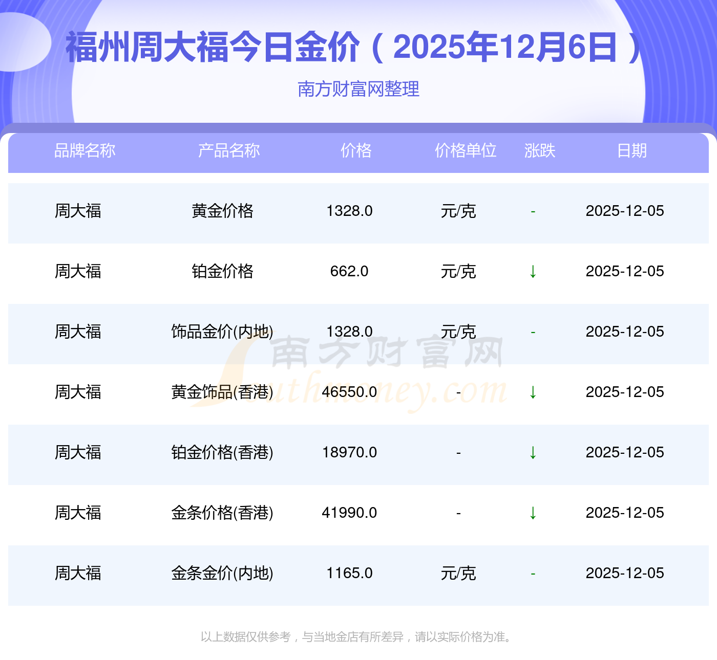 2025年12月6日福州周大福一克黃金的售價是多少:黃金價格1328.0元/克,鉑金價格662.0元/克,飾品金價(內地)1328.0元/克,黃金飾品(香港)46550.0,鉑金價格(香港)18970.0,金條價格(香港)41990.0,金條金價(內地)1165.0元/克,黃金價格1325.0元/克,鉑金價格600.0元/克,足金價格1325.0元/克,黃金價格1289.0元/克。