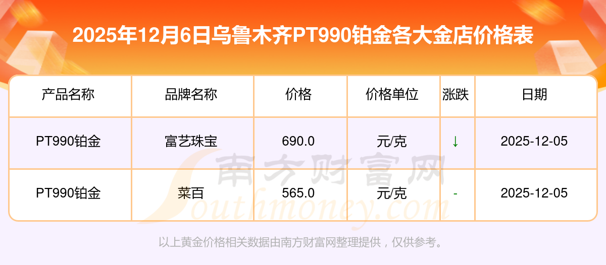 2025年12月6日,烏魯木齊周大福、周大福、周大福、周大福、周大福、周大福、周大福、老鳳祥、老鳳祥、老鳳祥、周六福等各大金店品牌PT990鉑金今日價格行情最新來了:周大福1328.0元/克、周大福662.0元/克、周大福1328.0元/克、周大福46550.0、周大福18970.0、周大福41990.0、周大福1165.0元/克、老鳳祥1325.0元/克、老鳳祥600.0元/克、老鳳祥1325.0元/克、周六福1289.0元/克。