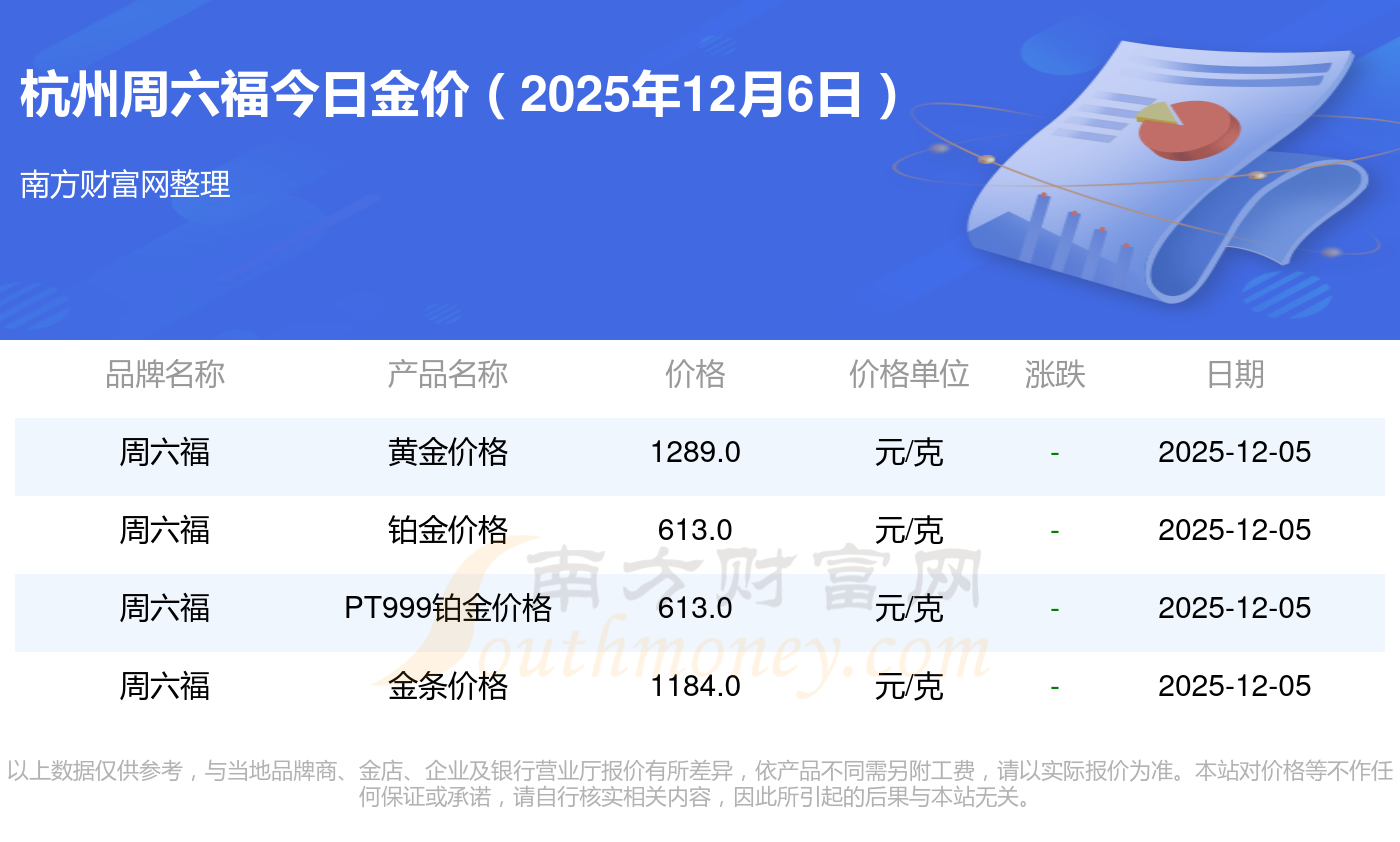 今天黃金價格是多少?現在黃金一克的價錢是怎樣的?2025年12月6日杭州周六福黃金一克的市場行情價是多少?黃金價格1328.0元/克,鉑金價格662.0元/克,飾品金價(內地)1328.0元/克,黃金飾品(香港)46550.0,鉑金價格(香港)18970.0,金條價格(香港)41990.0,金條金價(內地)1165.0元/克,黃金價格1325.0元/克,鉑金價格600.0元/克,足金價格1325.0元/克,黃金價格1289.0元/克。