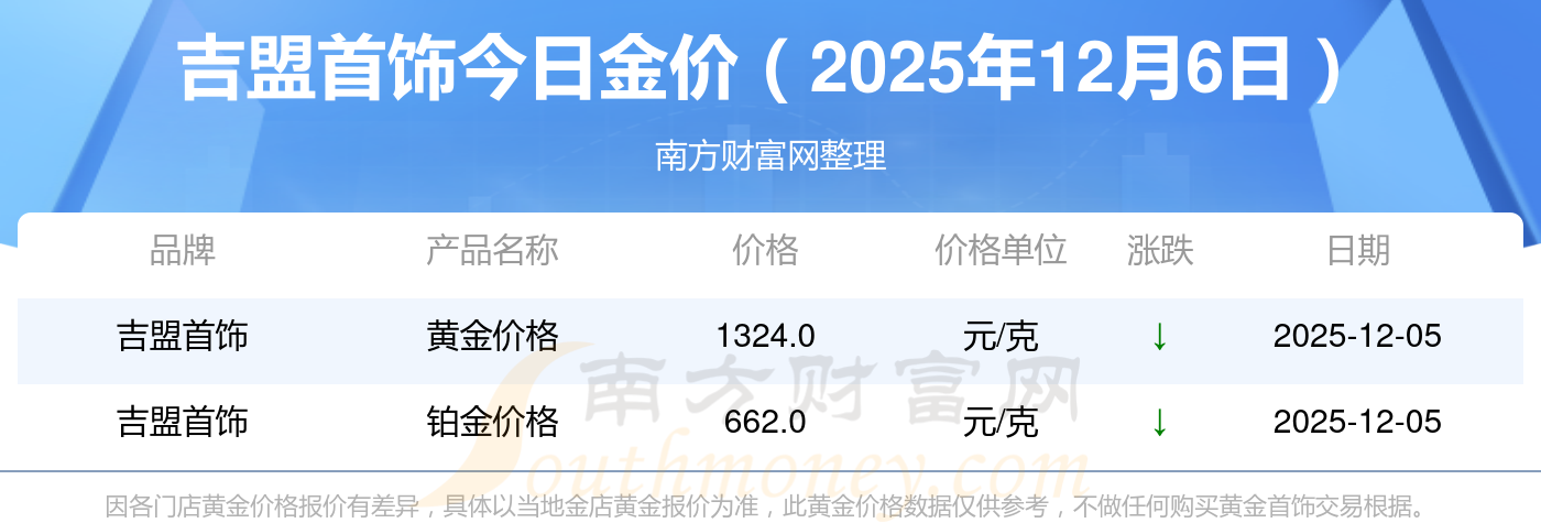 2025年12月6日吉盟首飾金價查詢:黃金價格1328.0元/克,鉑金價格662.0元/克,飾品金價(內地)1328.0元/克,黃金飾品(香港)46550.0,鉑金價格(香港)18970.0,金條價格(香港)41990.0,金條金價(內地)1165.0元/克,黃金價格1325.0元/克,鉑金價格600.0元/克,足金價格1325.0元/克,黃金價格1289.0元/克。