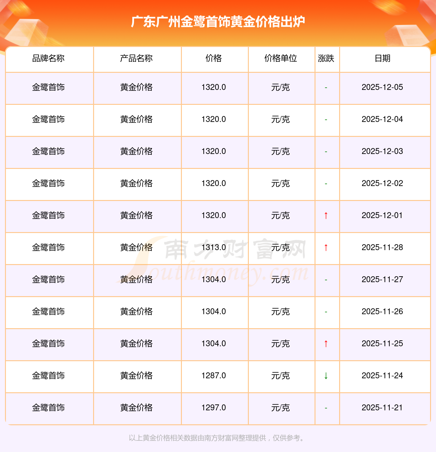 今日廣東廣州金鷺首飾黃金價(jià)格公布黃金價(jià)格今天多少一克今日(2025年12月6日),1320.0元/克是廣東廣州金鷺首飾黃金價(jià)格的價(jià)格標(biāo)準(zhǔn)。