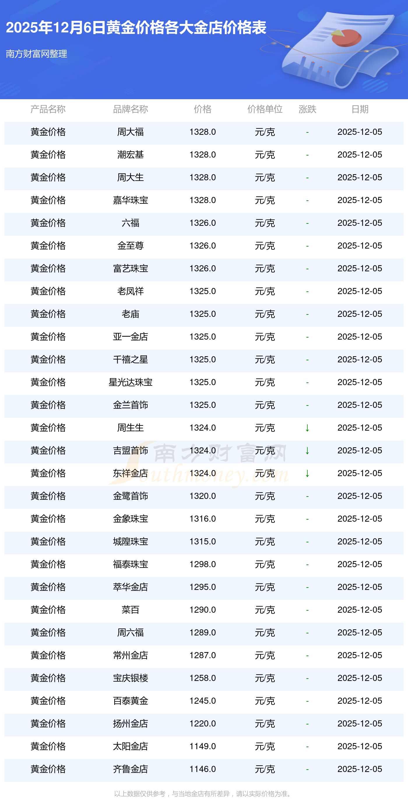 今天是2025年12月6日,周大福、周大福、周大福、周大福、周大福、周大福、周大福、老鳳祥、老鳳祥、老鳳祥、周六福等各大金店品牌黃金價格最新價格如下:周大福1328.0元/克、周大福662.0元/克、周大福1328.0元/克、周大福46550.0、周大福18970.0、周大福41990.0、周大福1165.0元/克、老鳳祥1325.0元/克、老鳳祥600.0元/克、老鳳祥1325.0元/克、周六福1289.0元/克。