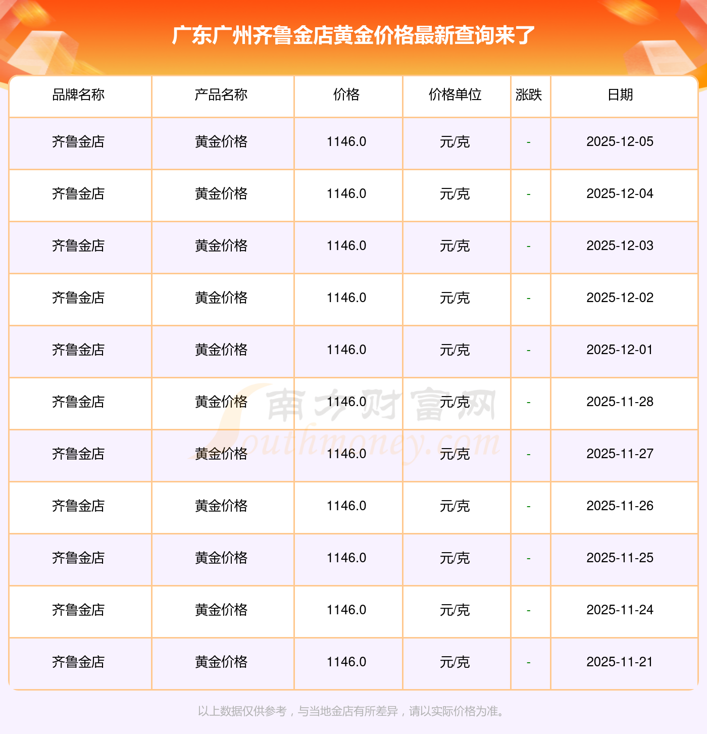 今日廣東廣州齊魯金店黃金價格公布想咨詢下,今日黃金每克要多少錢廣東廣州齊魯金店在 2025年12月6日的黃金價格零售價格為 1146.0元/克。