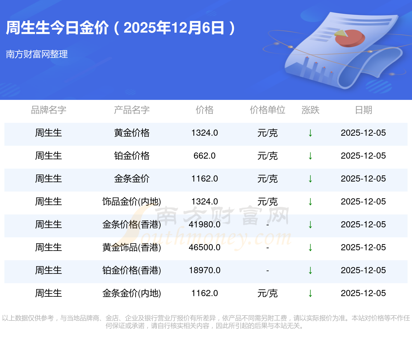 2025年12月6日周生生最新價格:黃金價格1328.0元/克,鉑金價格662.0元/克,飾品金價(內地)1328.0元/克,黃金飾品(香港)46550.0,鉑金價格(香港)18970.0,金條價格(香港)41990.0,金條金價(內地)1165.0元/克,黃金價格1325.0元/克,鉑金價格600.0元/克,足金價格1325.0元/克,黃金價格1289.0元/克。