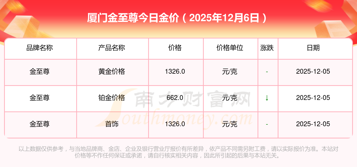 2025年12月6日廈門金至尊最新價格:黃金價格1328.0元/克,鉑金價格662.0元/克,飾品金價(內地)1328.0元/克,黃金飾品(香港)46550.0,鉑金價格(香港)18970.0,金條價格(香港)41990.0,金條金價(內地)1165.0元/克,黃金價格1325.0元/克,鉑金價格600.0元/克,足金價格1325.0元/克,黃金價格1289.0元/克。
