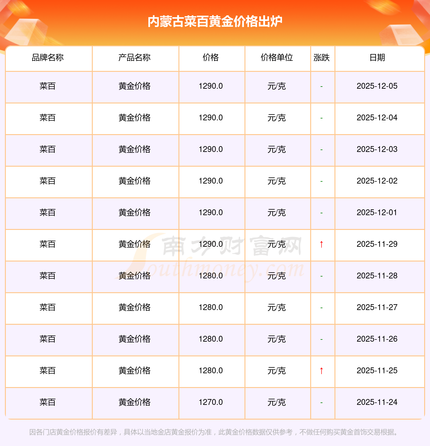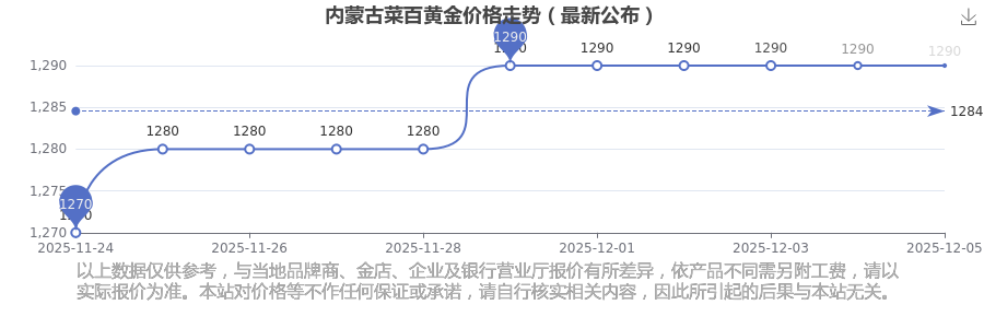 2025年12月6日內蒙古菜百黃金價格為1290.0元/克。