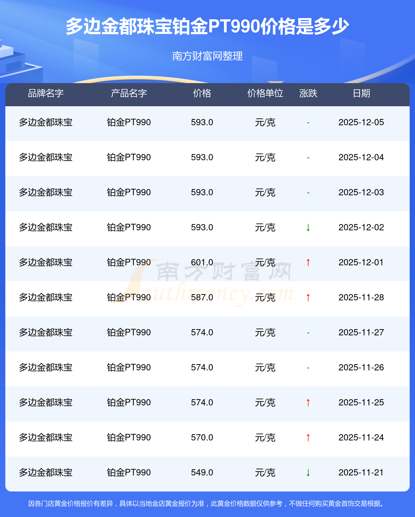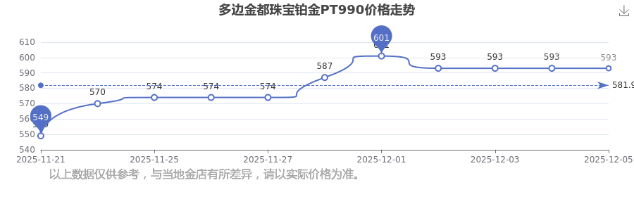 今日多邊金都珠寶鉑金PT990價格為593.0元/克。