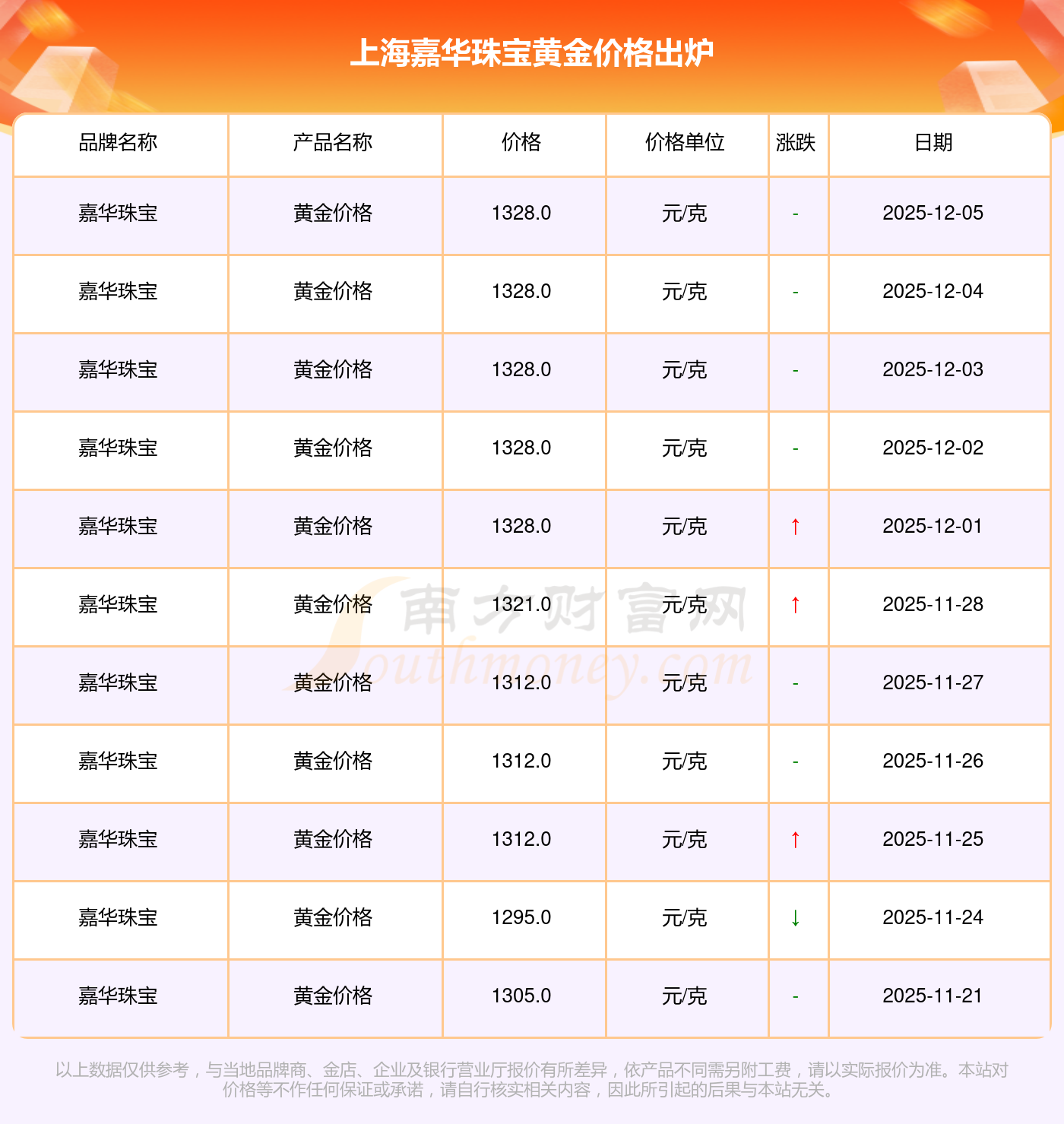 以上數(shù)據(jù)僅供參考,與當(dāng)?shù)仄放粕獭⒔鸬辍⑵髽I(yè)及銀行營業(yè)廳報(bào)價(jià)有所差異,依產(chǎn)品不同需另附工費(fèi),請(qǐng)以實(shí)際報(bào)價(jià)為準(zhǔn)。本站對(duì)價(jià)格等不作任何保證或承諾,請(qǐng)自行核實(shí)相關(guān)內(nèi)容,因此所引起的后果與本站無關(guān)。