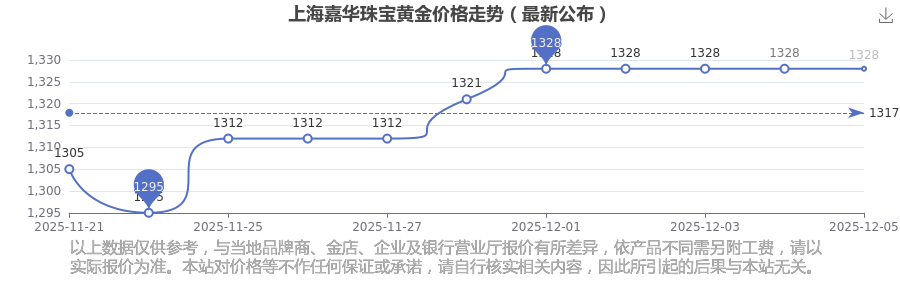 今日上海嘉華珠寶黃金價(jià)格公布今日黃金的克重價(jià)格是多少2025年12月6日,上海嘉華珠寶黃金價(jià)格每克的價(jià)值量定格在1328.0元/克。
