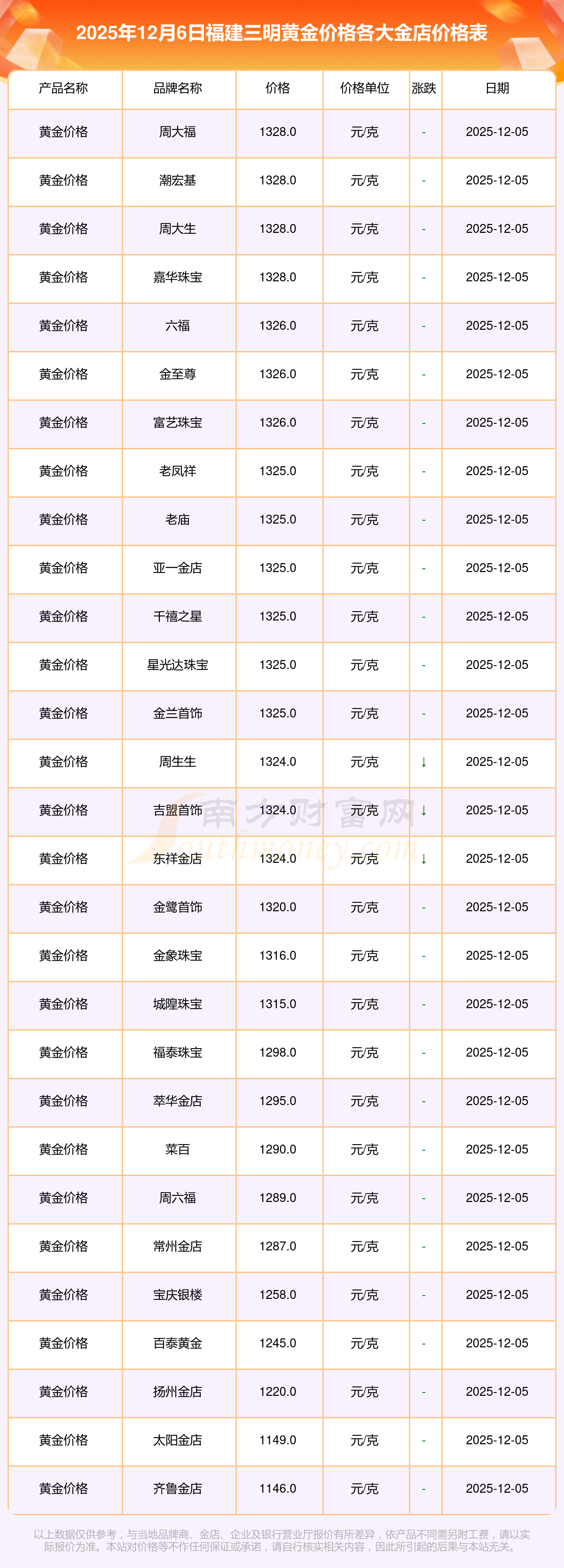 2025年12月6日,福建三明周大福、周大福、周大福、周大福、周大福、周大福、周大福、老鳳祥、老鳳祥、老鳳祥、周六福等各大金店品牌黃金價格今日價格如下:周大福1328.0元/克、周大福662.0元/克、周大福1328.0元/克、周大福46550.0、周大福18970.0、周大福41990.0、周大福1165.0元/克、老鳳祥1325.0元/克、老鳳祥600.0元/克、老鳳祥1325.0元/克、周六福1289.0元/克。