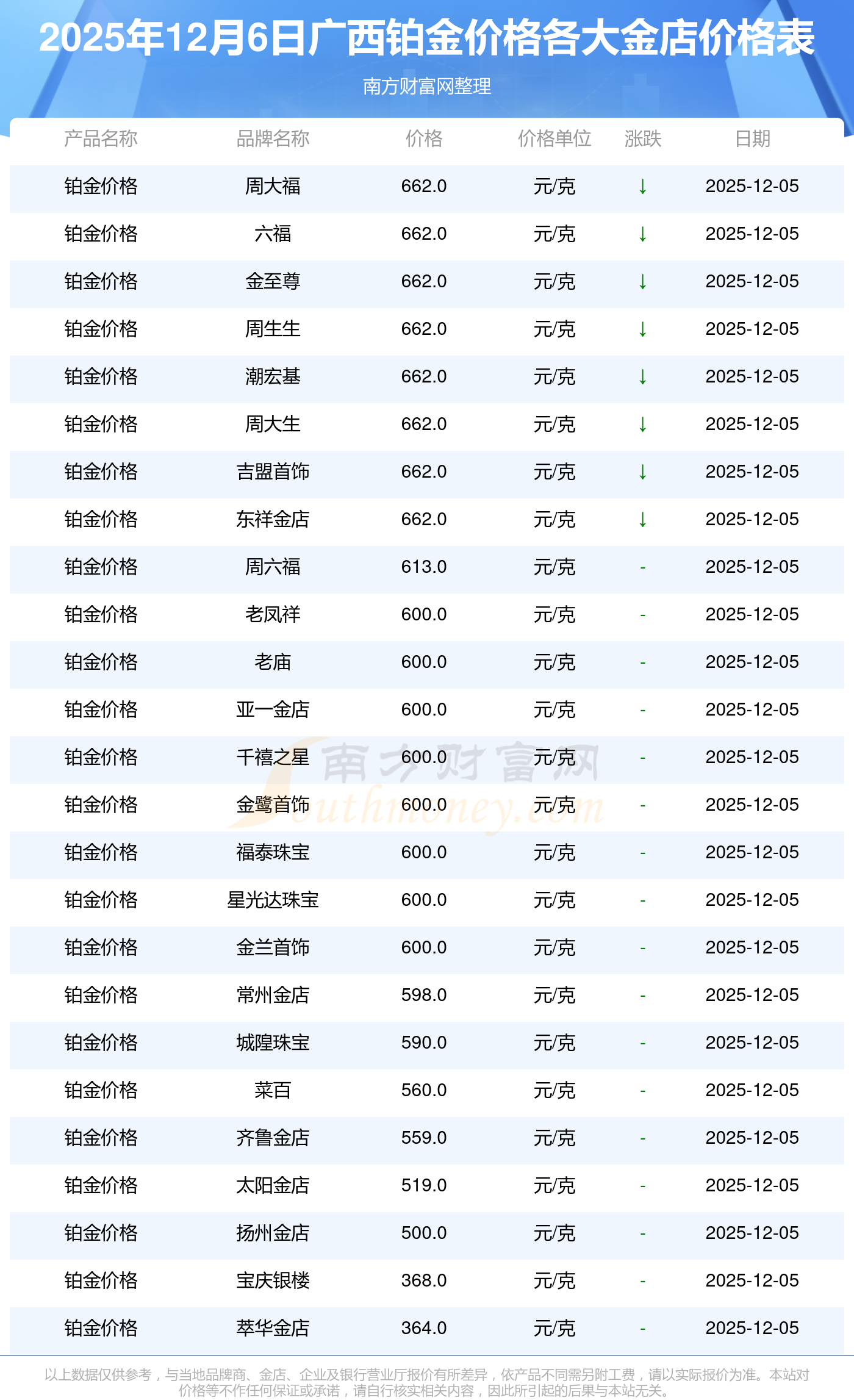 2025年12月6日廣西周大福、周大福、周大福、周大福、周大福、周大福、周大福、老鳳祥、老鳳祥、老鳳祥、周六福等各大金店品牌鉑金價格最新價格如下:周大福黃金價格1328.0元/克,周大福鉑金價格662.0元/克,周大福飾品金價(內地)1328.0元/克,周大福黃金飾品(香港)46550.0,周大福鉑金價格(香港)18970.0,周大福金條價格(香港)41990.0,周大福金條金價(內地)1165.0元/克,老鳳祥黃金價格1325.0元/克,老鳳祥鉑金價格600.0元/克,老鳳祥足金價格1325.0元/克,周六福黃金價格1289.0元/克。