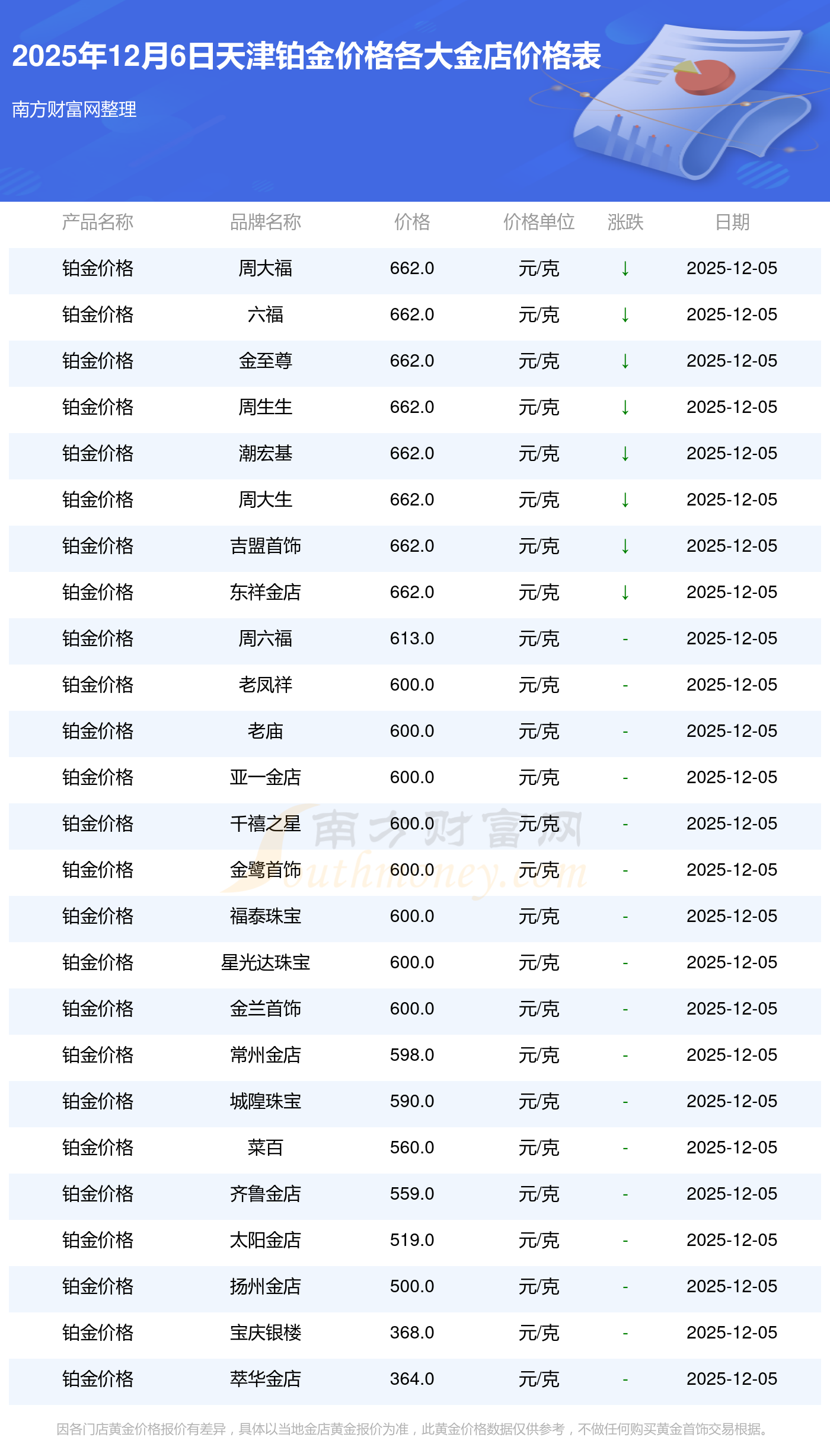 今天是2025年12月6日,天津周大福、周大福、周大福、周大福、周大福、周大福、周大福、老鳳祥、老鳳祥、老鳳祥、周六福等各大金店品牌鉑金價格最新價格如下:周大福1328.0元/克、周大福662.0元/克、周大福1328.0元/克、周大福46550.0、周大福18970.0、周大福41990.0、周大福1165.0元/克、老鳳祥1325.0元/克、老鳳祥600.0元/克、老鳳祥1325.0元/克、周六福1289.0元/克。