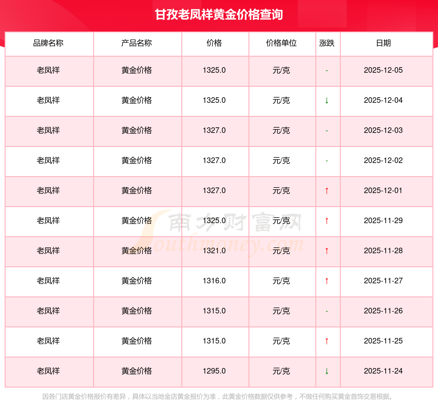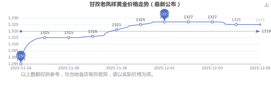 2025年12月6日甘孜老鳳祥黃金價格為1325.0元/克。
