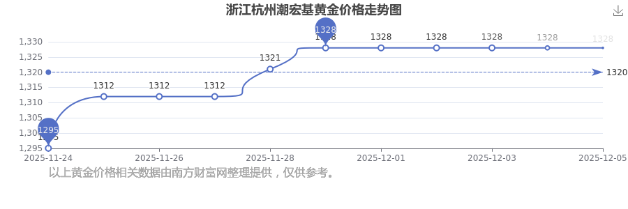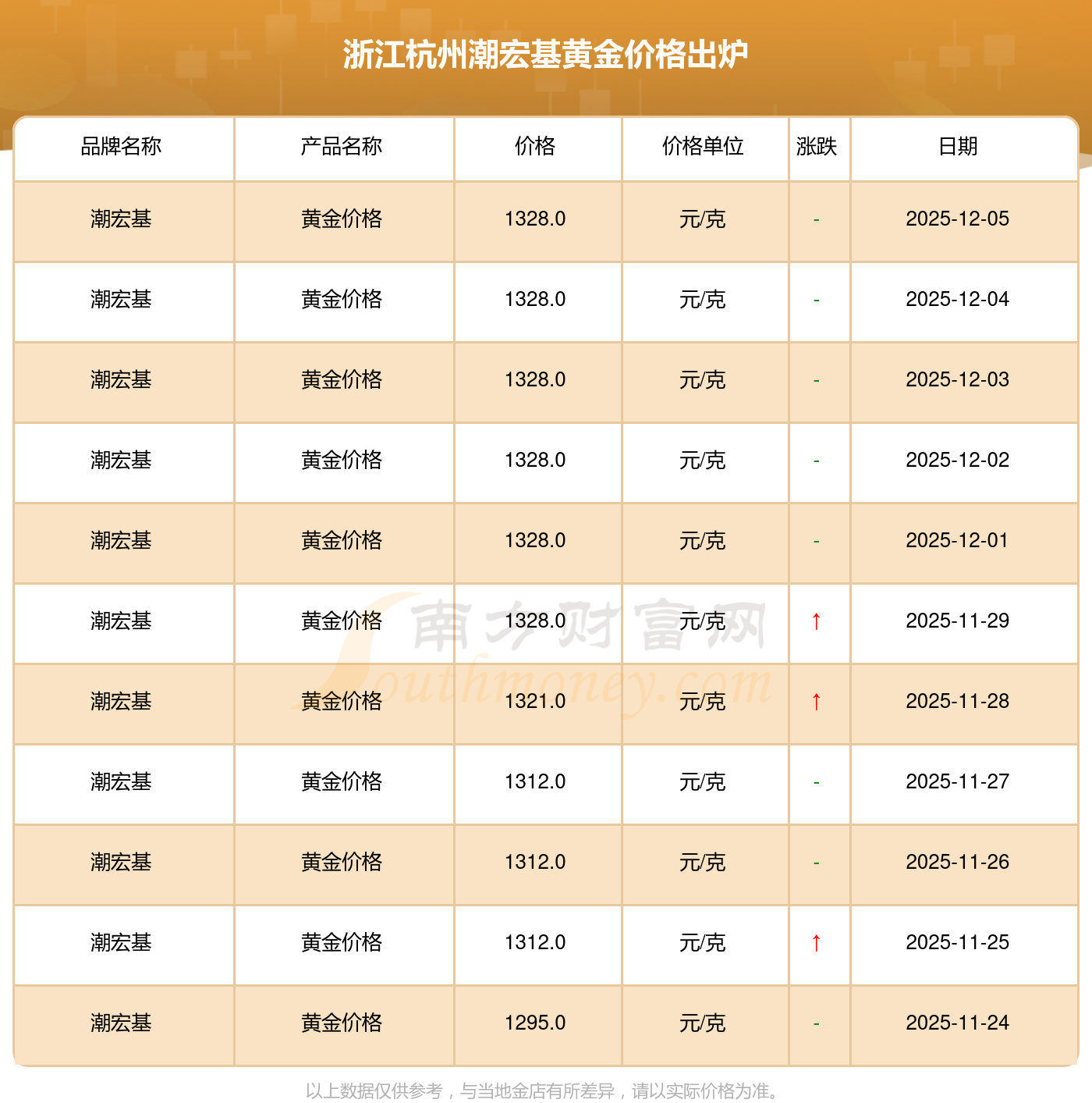 2025年12月6日,浙江杭州潮宏基所售黃金價格,其價格設定為 1328.0元/克。