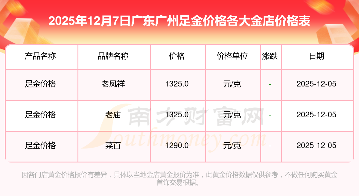 今天是2025年12月7日,廣東廣州周大福、周大福、周大福、周大福、周大福、周大福、周大福、老鳳祥、老鳳祥、老鳳祥、周六福等各大金店品牌足金價格最新價格行情是這樣的:周大福1328.0元/克、周大福662.0元/克、周大福1328.0元/克、周大福46550.0、周大福18970.0、周大福41990.0、周大福1165.0元/克、老鳳祥1325.0元/克、老鳳祥600.0元/克、老鳳祥1325.0元/克、周六福1289.0元/克。