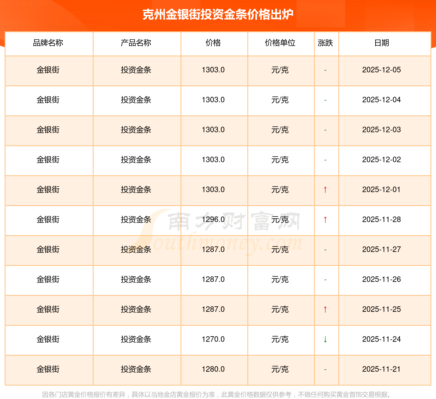 2025年12月7日,克州金銀街投資金條每克的價值量定格在1303.0元/克。