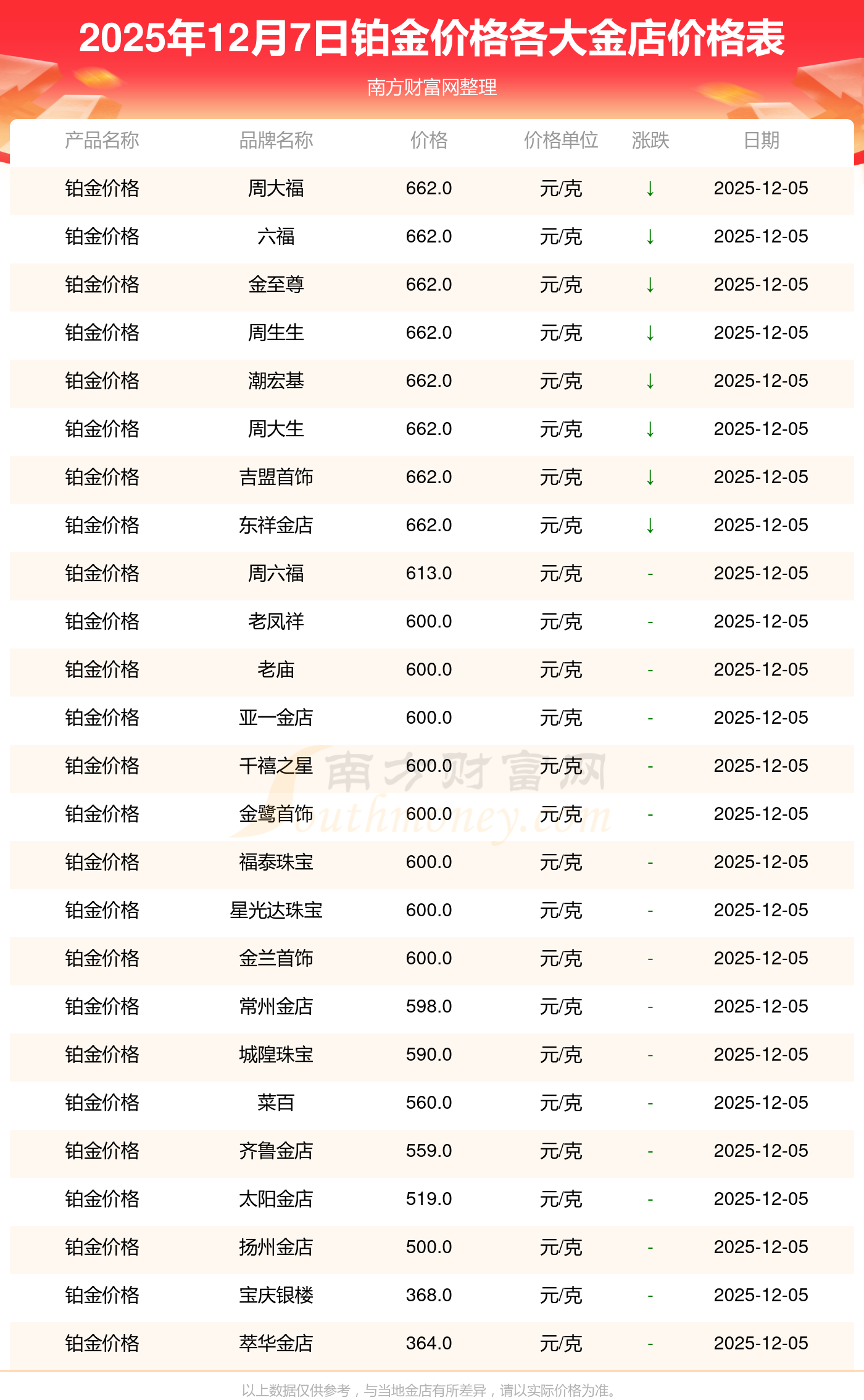今天是2025年12月7日,周大福、周大福、周大福、周大福、周大福、周大福、周大福、老鳳祥、老鳳祥、老鳳祥、周六福等各大金店品牌鉑金價格最新價格如下:周大福1328.0元/克、周大福662.0元/克、周大福1328.0元/克、周大福46550.0、周大福18970.0、周大福41990.0、周大福1165.0元/克、老鳳祥1325.0元/克、老鳳祥600.0元/克、老鳳祥1325.0元/克、周六福1289.0元/克。