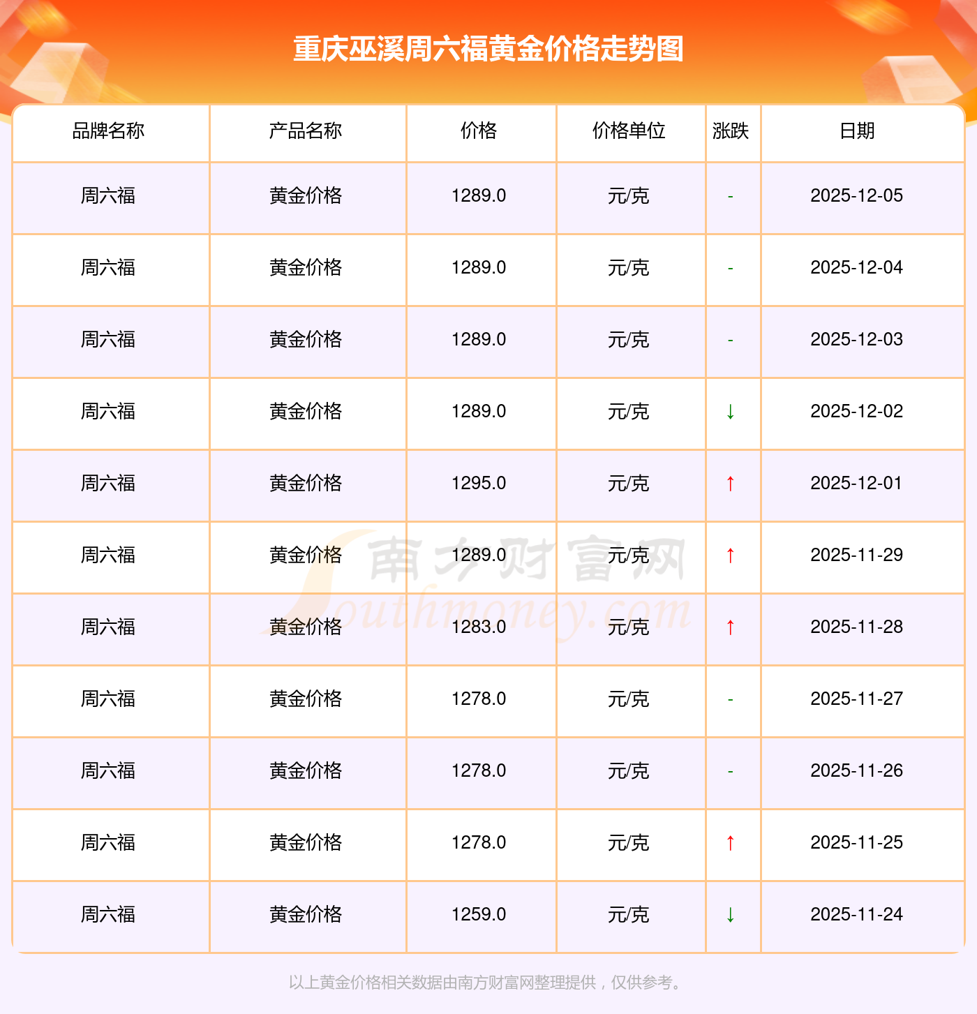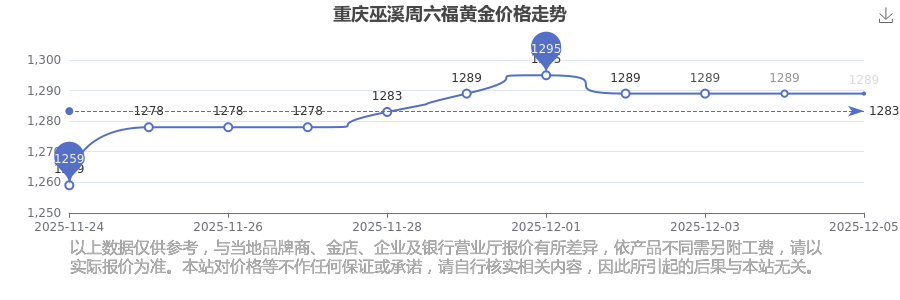 2025年12月7日重慶巫溪周六福黃金價格為1289.0元/克。