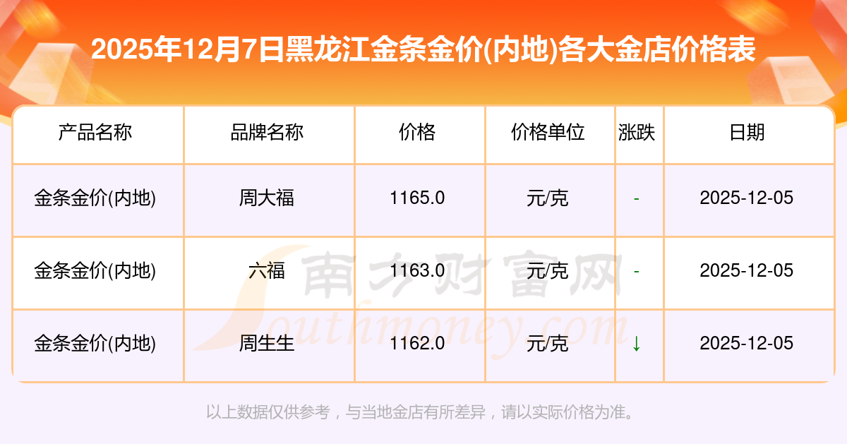 2025年12月7日黑龍江各大金店金條金價(內地)最新價格:周大福1328.0元/克,周大福662.0元/克,周大福1328.0元/克,周大福46550.0,周大福18970.0,周大福41990.0,周大福1165.0元/克,老鳳祥1325.0元/克,老鳳祥600.0元/克,老鳳祥1325.0元/克,周六福1289.0元/克。