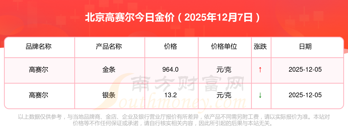 2025年12月7日北京高賽爾黃金按克計價,現在多少錢一克?黃金價格1328.0元/克,鉑金價格662.0元/克,飾品金價(內地)1328.0元/克,黃金飾品(香港)46550.0,鉑金價格(香港)18970.0,金條價格(香港)41990.0,金條金價(內地)1165.0元/克,黃金價格1325.0元/克,鉑金價格600.0元/克,足金價格1325.0元/克,黃金價格1289.0元/克。