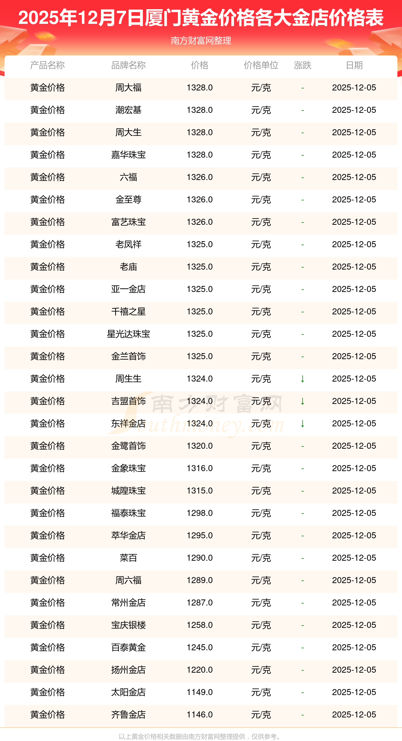 2025年12月7日廈門各大金店黃金價格最新價格查詢來了:周大福1328.0元/克,周大福662.0元/克,周大福1328.0元/克,周大福46550.0,周大福18970.0,周大福41990.0,周大福1165.0元/克,老鳳祥1325.0元/克,老鳳祥600.0元/克,老鳳祥1325.0元/克,周六福1289.0元/克。