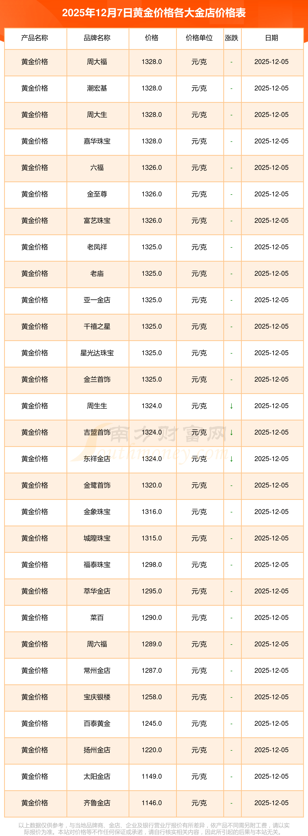 2025年12月7日,周大福、周大福、周大福、周大福、周大福、周大福、周大福、老鳳祥、老鳳祥、老鳳祥、周六福等各大金店品牌黃金價(jià)格今日價(jià)格如下:周大福1328.0元/克、周大福662.0元/克、周大福1328.0元/克、周大福46550.0、周大福18970.0、周大福41990.0、周大福1165.0元/克、老鳳祥1325.0元/克、老鳳祥600.0元/克、老鳳祥1325.0元/克、周六福1289.0元/克。