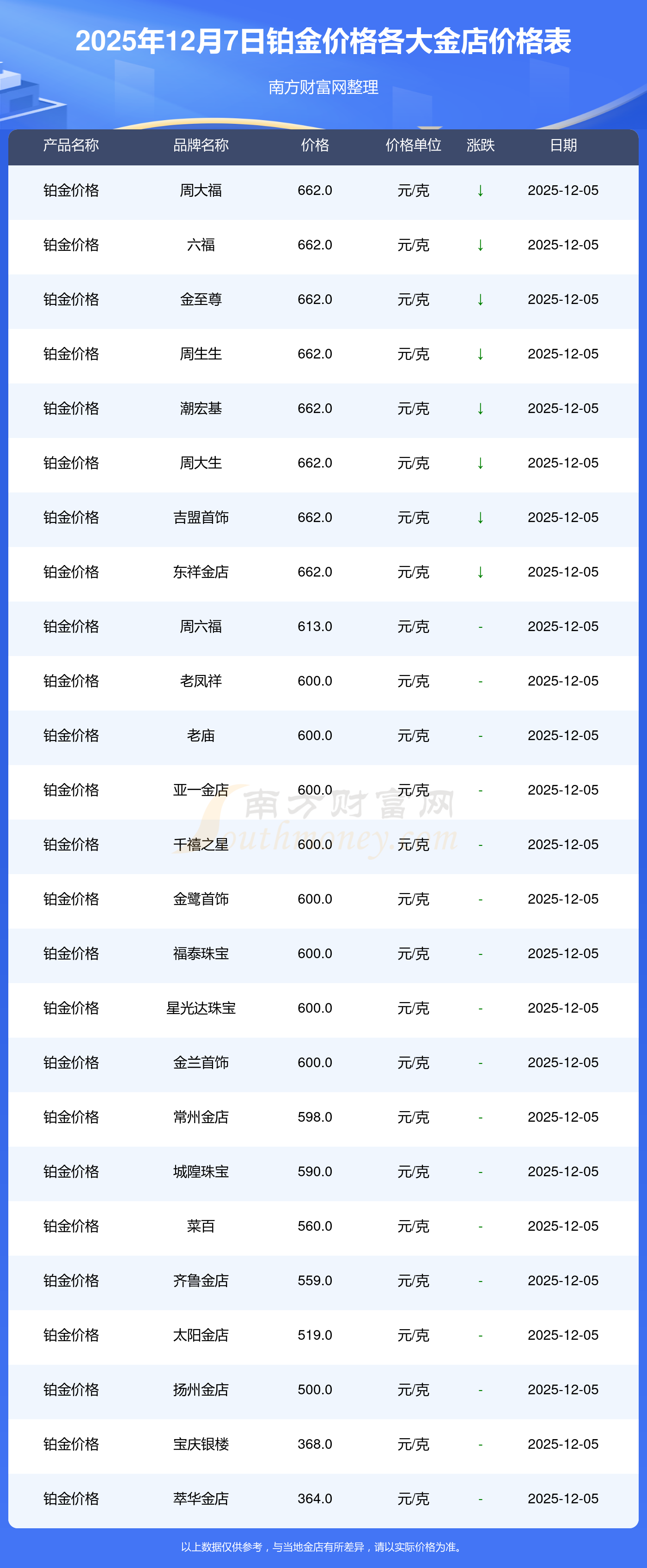 2025年12月7日各大金店鉑金價格最新價格:周大福1328.0元/克,周大福662.0元/克,周大福1328.0元/克,周大福46550.0,周大福18970.0,周大福41990.0,周大福1165.0元/克,老鳳祥1325.0元/克,老鳳祥600.0元/克,老鳳祥1325.0元/克,周六福1289.0元/克。