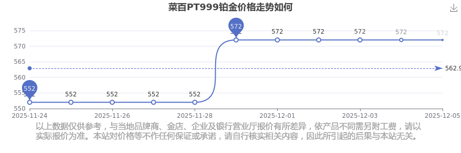 今日(2025年12月7日)菜百PT999鉑金價格:572.0元/克。