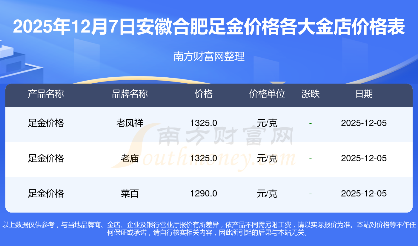 今天是2025年12月7日,安徽合肥周大福、周大福、周大福、周大福、周大福、周大福、周大福、老鳳祥、老鳳祥、老鳳祥、周六福等各大金店品牌足金價格最新價格如下:周大福1328.0元/克、周大福662.0元/克、周大福1328.0元/克、周大福46550.0、周大福18970.0、周大福41990.0、周大福1165.0元/克、老鳳祥1325.0元/克、老鳳祥600.0元/克、老鳳祥1325.0元/克、周六福1289.0元/克。