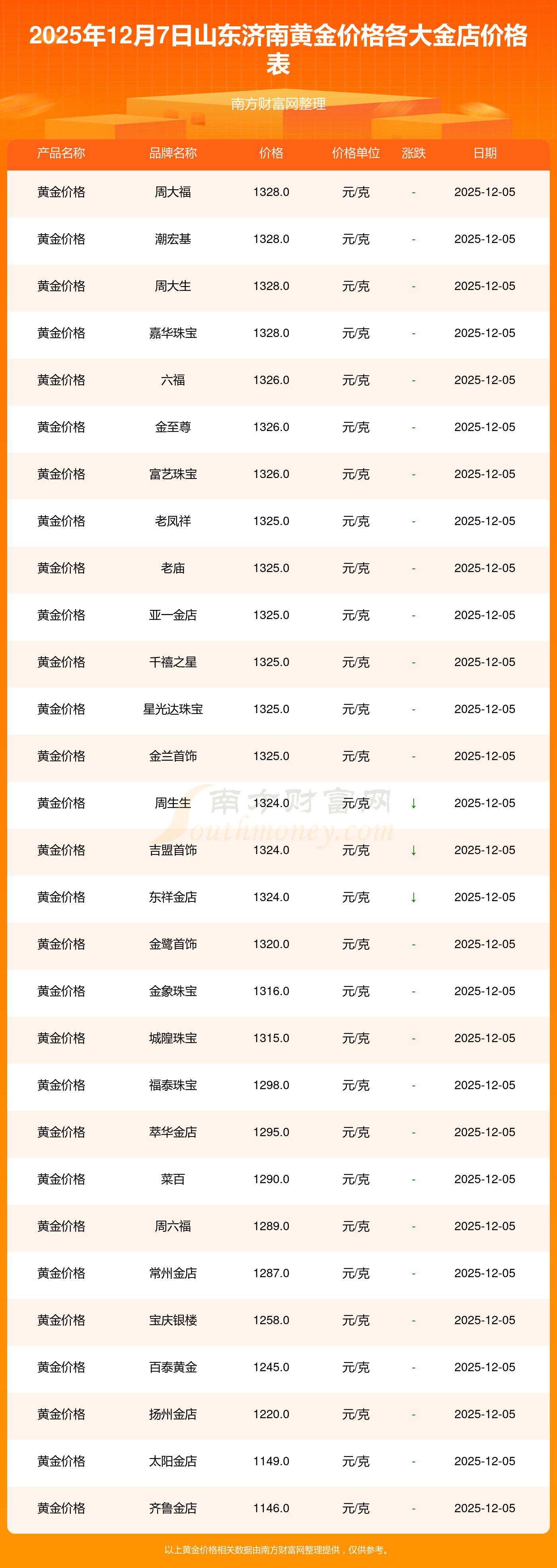 今天是2025年12月7日,山東濟南周大福、周大福、周大福、周大福、周大福、周大福、周大福、老鳳祥、老鳳祥、老鳳祥、周六福等各大金店品牌黃金價格最新價格如下:周大福1328.0元/克、周大福662.0元/克、周大福1328.0元/克、周大福46550.0、周大福18970.0、周大福41990.0、周大福1165.0元/克、老鳳祥1325.0元/克、老鳳祥600.0元/克、老鳳祥1325.0元/克、周六福1289.0元/克。
