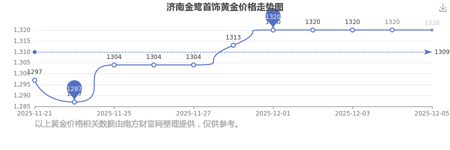 2025年12月7日濟南金鷺首飾黃金價格:1320.0元/克。
