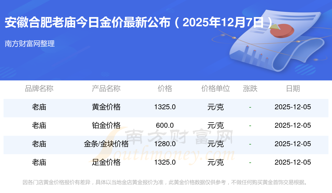 2025年12月7日安徽合肥老廟金價查詢:黃金價格1328.0元/克,鉑金價格662.0元/克,飾品金價(內地)1328.0元/克,黃金飾品(香港)46550.0,鉑金價格(香港)18970.0,金條價格(香港)41990.0,金條金價(內地)1165.0元/克,黃金價格1325.0元/克,鉑金價格600.0元/克,足金價格1325.0元/克,黃金價格1289.0元/克。