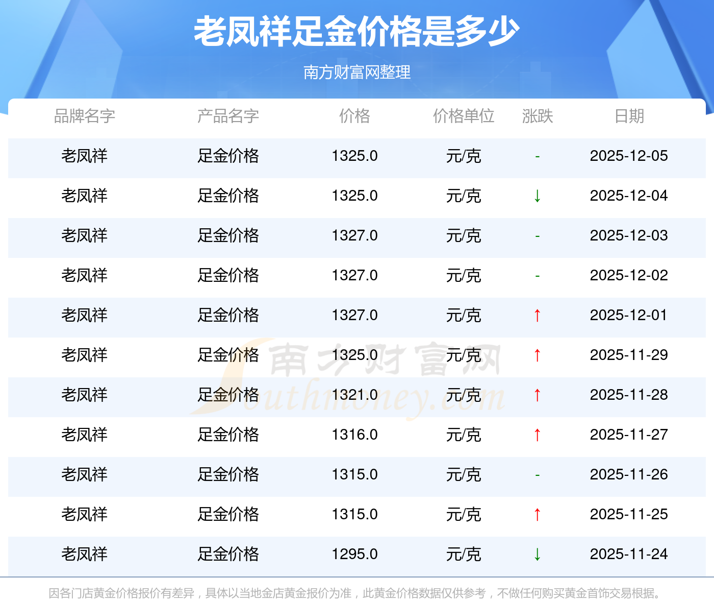 今日老鳳祥足金價格最新查詢:1325.0元/克。