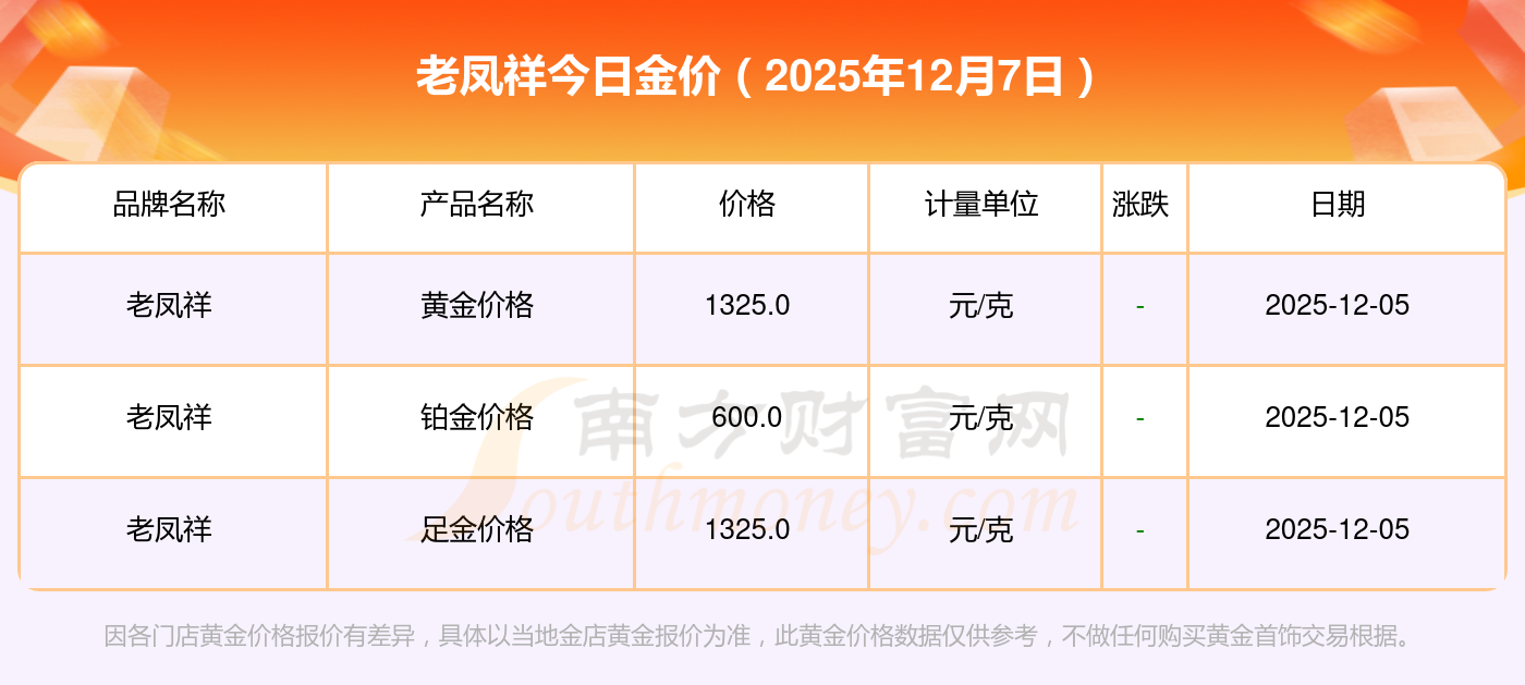 2025年12月7日周大福、周大福、周大福、周大福、周大福、周大福、周大福、老鳳祥、老鳳祥、老鳳祥、周六福等各大金店品牌黃金價格最新價格如下:周大福黃金價格1328.0元/克,周大福鉑金價格662.0元/克,周大福飾品金價(內地)1328.0元/克,周大福黃金飾品(香港)46550.0,周大福鉑金價格(香港)18970.0,周大福金條價格(香港)41990.0,周大福金條金價(內地)1165.0元/克,老鳳祥黃金價格1325.0元/克,老鳳祥鉑金價格600.0元/克,老鳳祥足金價格1325.0元/克,周六福黃金價格1289.0元/克。