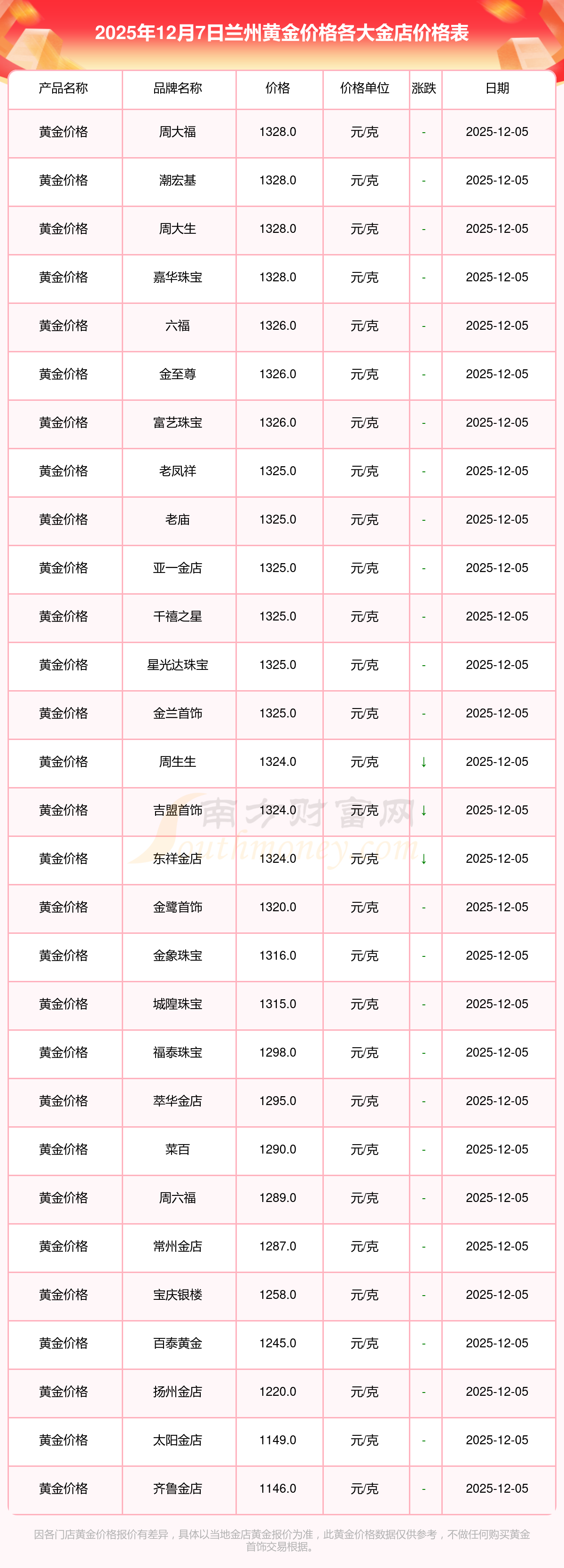 2025年12月7日,蘭州周大福、周大福、周大福、周大福、周大福、周大福、周大福、老鳳祥、老鳳祥、老鳳祥、周六福等各大金店品牌黃金價格今日價格行情最新來了:周大福1328.0元/克、周大福662.0元/克、周大福1328.0元/克、周大福46550.0、周大福18970.0、周大福41990.0、周大福1165.0元/克、老鳳祥1325.0元/克、老鳳祥600.0元/克、老鳳祥1325.0元/克、周六福1289.0元/克。